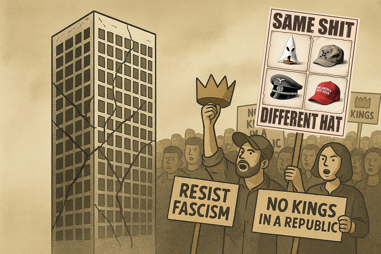 At the same time, across the country, another edifice was showing signs of collapse. The Trump administration, once fortified by spectacle and branding, was facing its own reckoning. Millions of Americans, fed up with what they saw as authoritarian drift and institutional erosion, took to the streets in the “No Kings” rallies. Nearly seven million people, from Fort Myers to Seattle, donned cardboard crowns and carried signs that read “Resist Fascism” and “No Kings in a Republic.” It was not just protest—it was a civic earthquake. Veterans, students, artists, and retirees marched not for a party, but for a principle: that governance built on optics and suppression cannot stand.