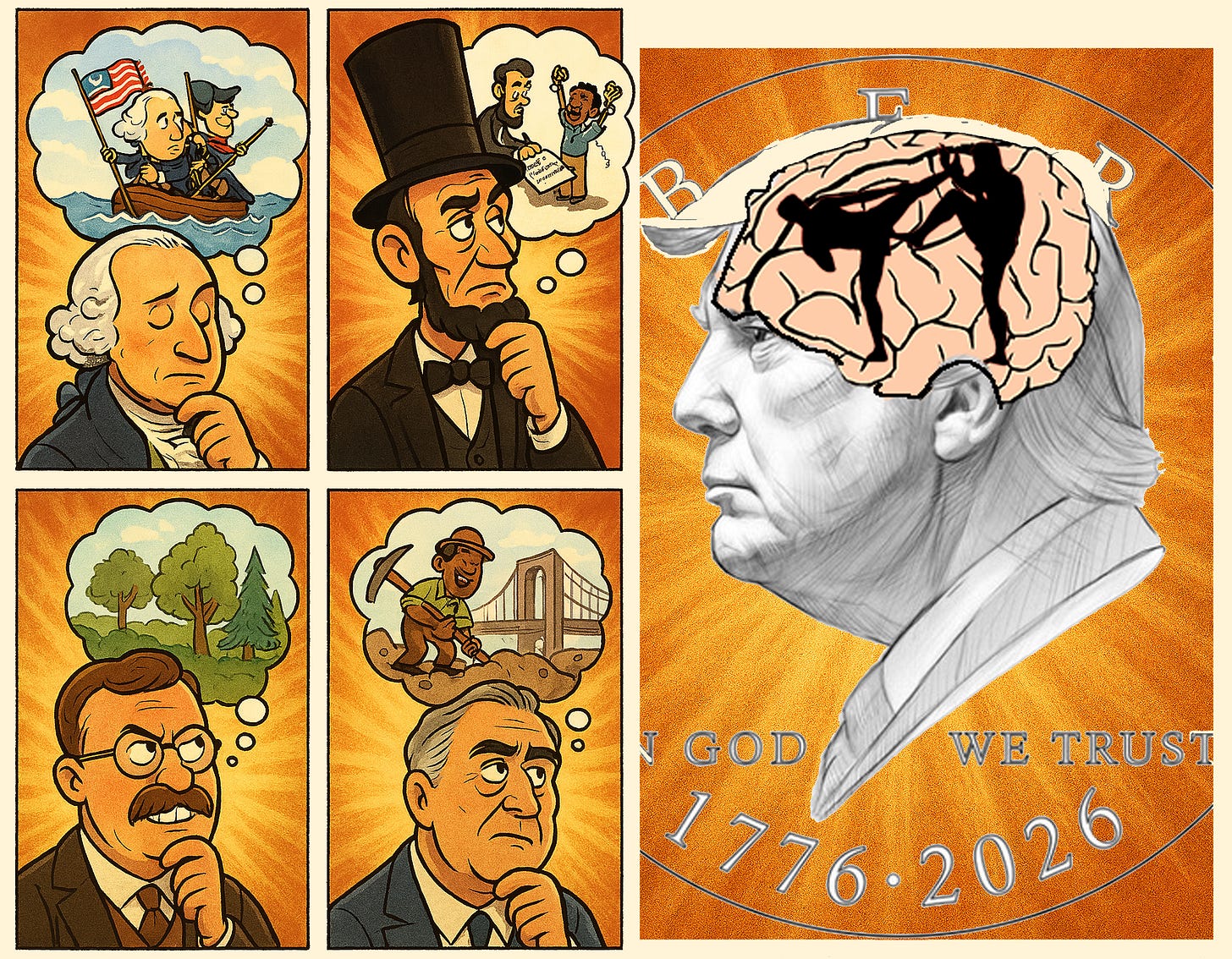 Then there’s Donald Trump. His imagined thought bubble bursts with spectacle: an MMA octagon erected on the White House lawn, fireworks overhead, fighters in red, white, and blue trunks circling each other while drones spell out “USA 250.” A bald eagle mascot referees the match. Trump stands center stage, arms raised like a ringmaster, basking in the glow of pay-per-view patriotism.