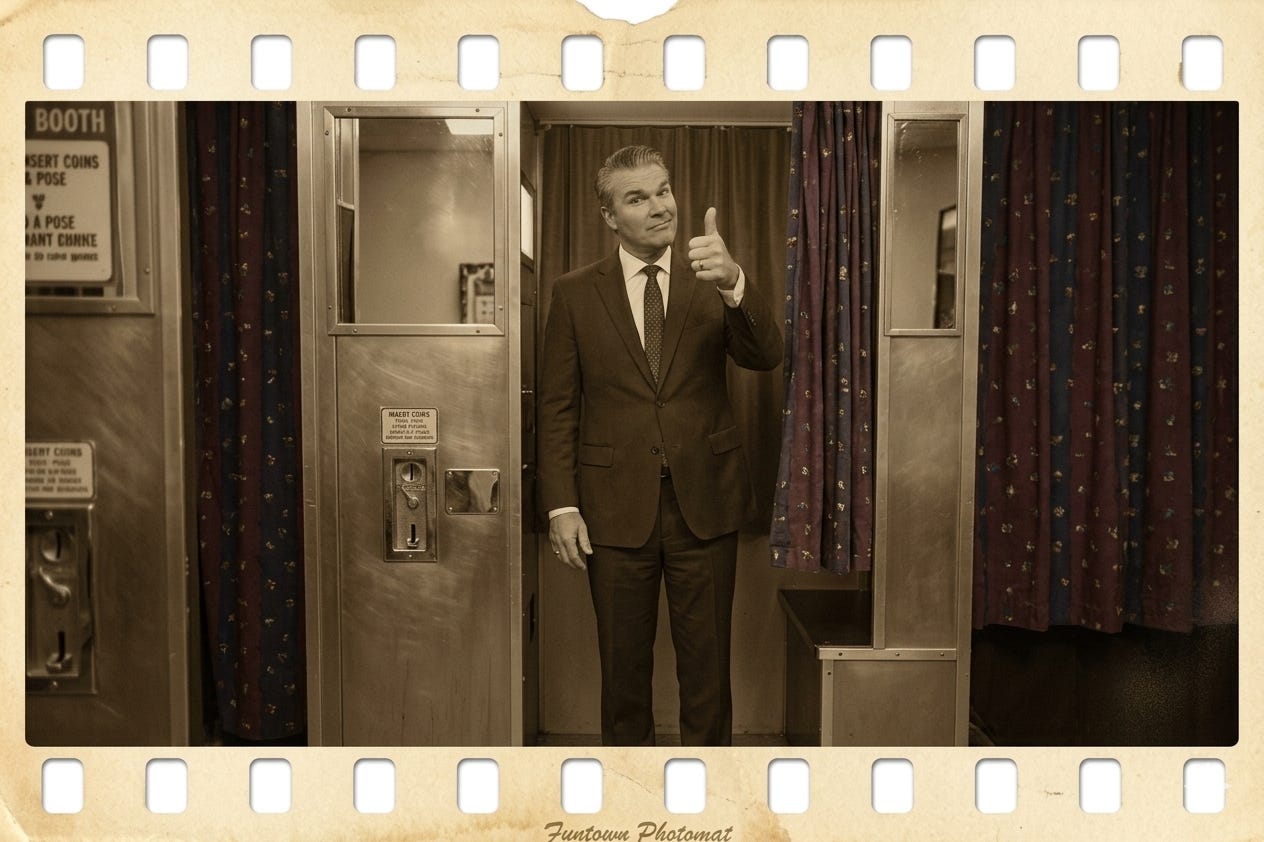 WASHINGTON, D.C. — The Pentagon, having reached its absolute limit with credentialed press photographers capturing Defense Secretary Pete Hegseth in ways that failed to convey what staffers described as “the full gravitas situation,” this week enacted a sweeping solution to the nation’s most pressing image crisis: they handed Hegseth a token, pointed him toward an automated photo booth in the Pentagon parking lot, and told him to sit professionally.